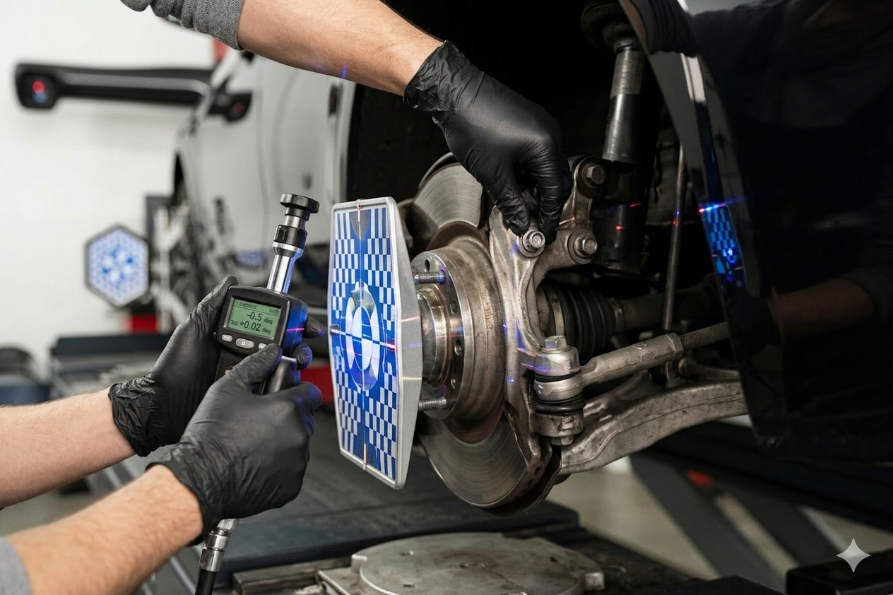 Inspect camber, caster, and toe settings